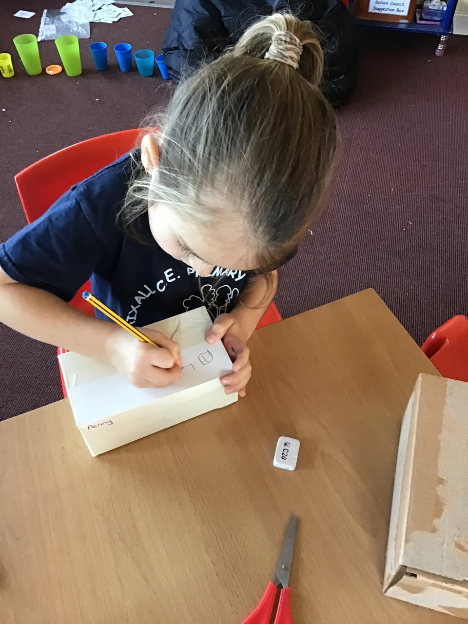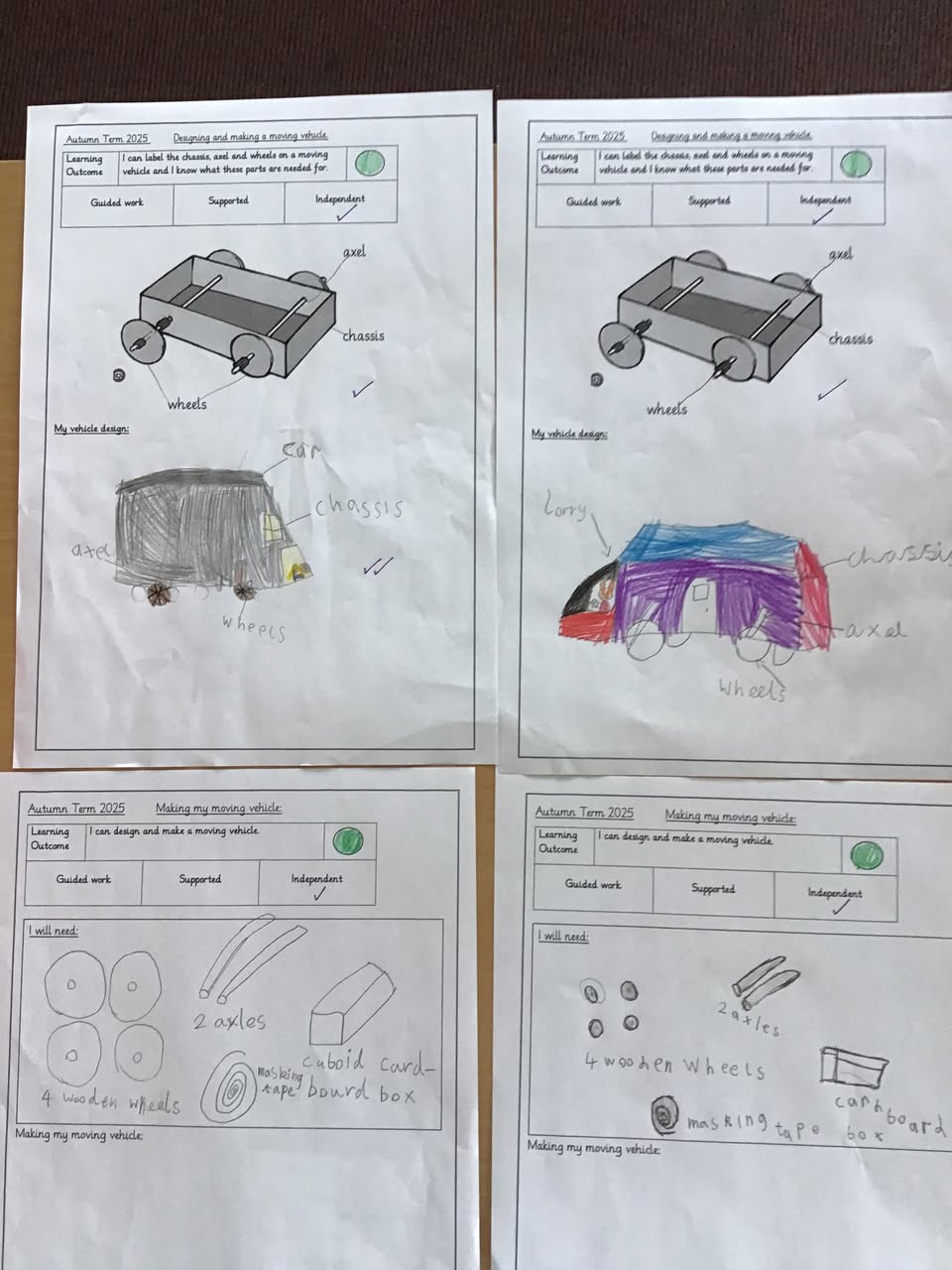 In their Design Technology lessons, the children in Mayfly and Skylark Classes are designing and making their own moving vehicles.